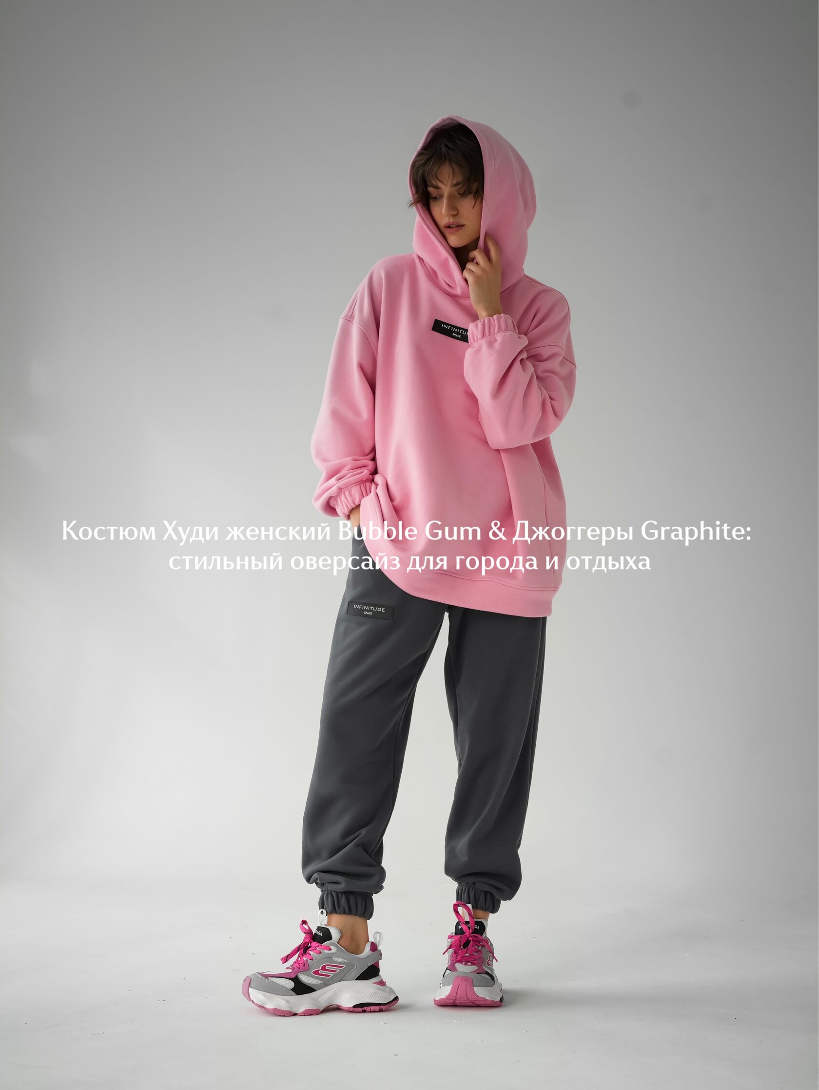 - Модный акцент — розовый худи и графитовые джоггеры создают стильный и запоминающийся образ.