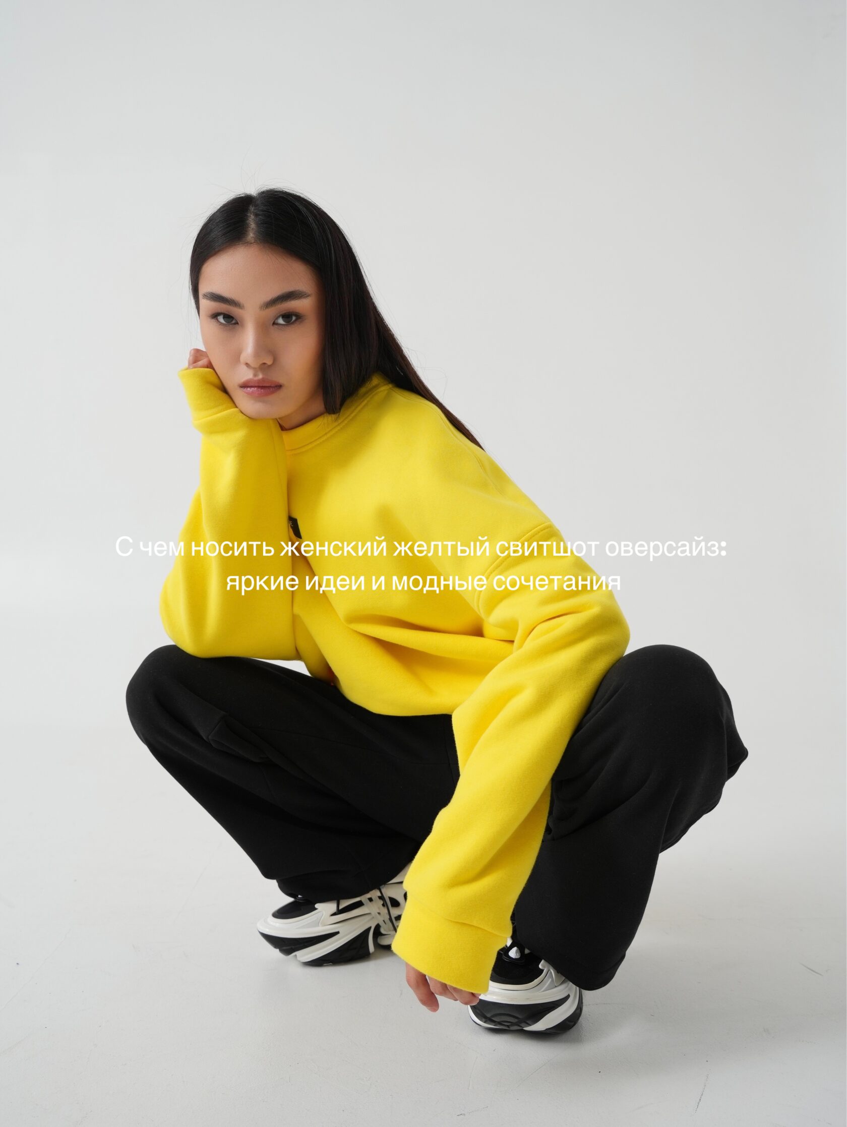 Женский желтый свитшот оверсайз — это вещь, которая способна оживить любой образ. Его можно сочетать с джинсами, юбками, платьями и костюмами. Он подчеркивает индивидуальность и добавляет уверенности.