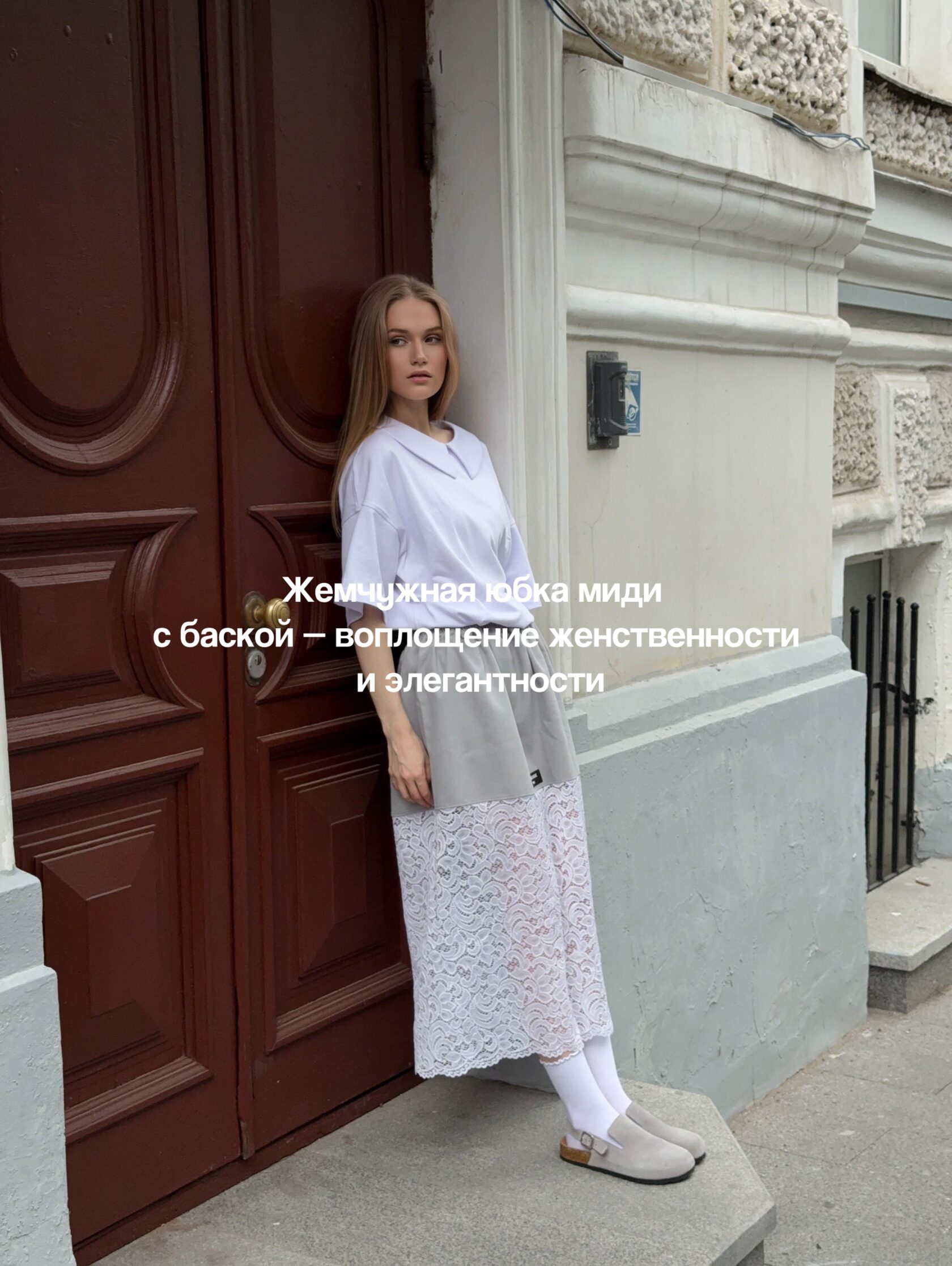 Модель прекрасно подчеркивает талию, визуально делает ноги стройнее, а образ — завершённым и продуманным. Если вы хотите добавить в свой гардероб нотку утончённости, шарма и лёгкой ретро-романтики — юбка миди жемчужная с баской будет идеальным решением.