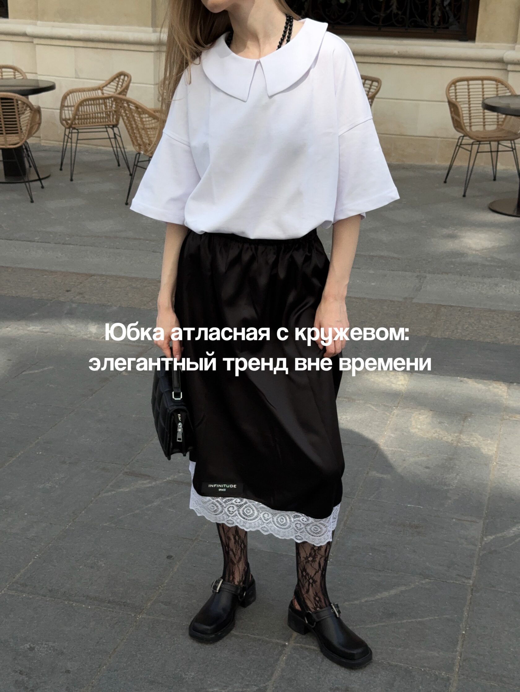 Тренд юбка черная атласная с кружевом отлично вписывается в разные образы: