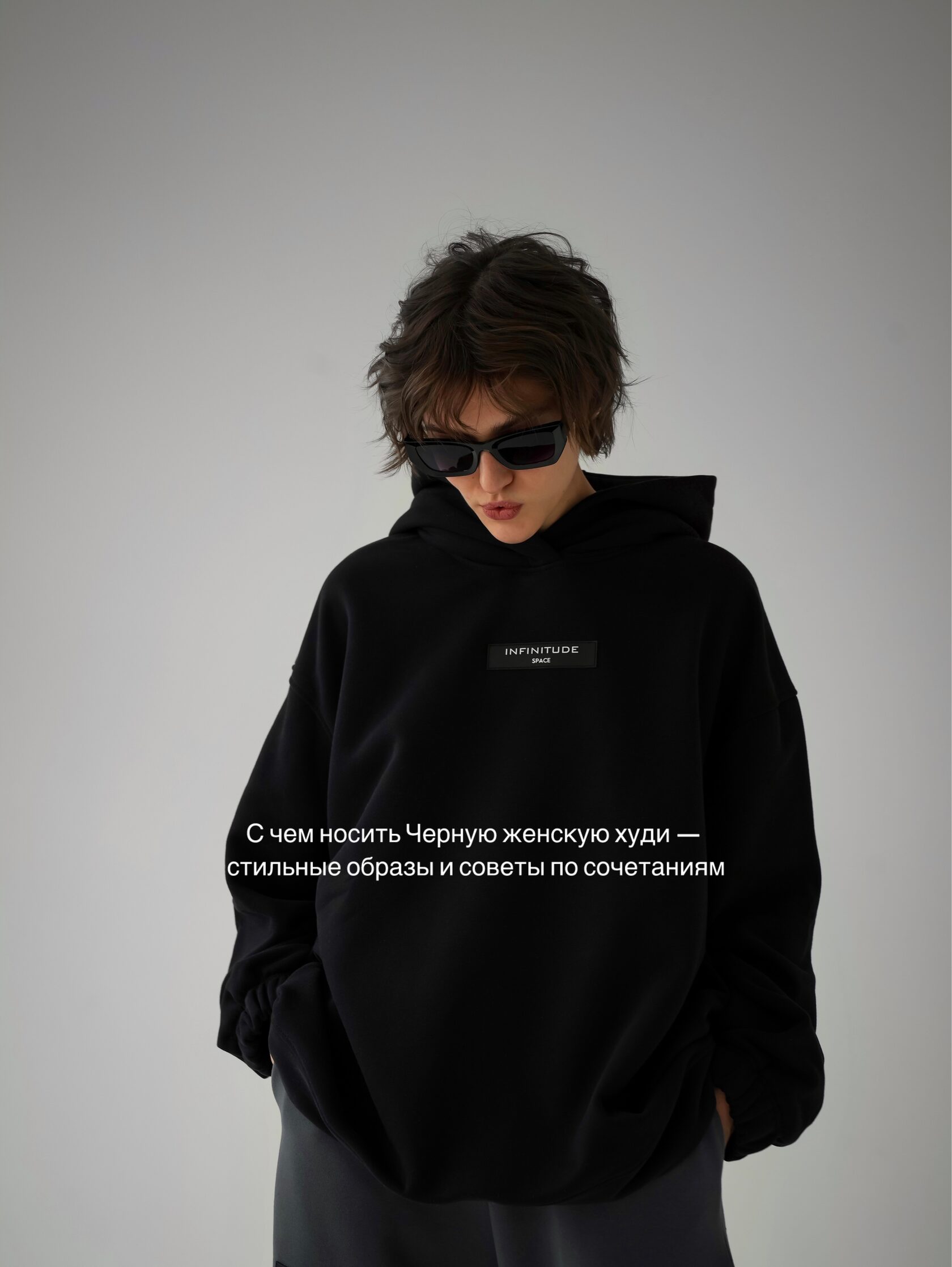 Если вы хотите подчеркнуть индивидуальность, комбинируйте черную женскую худи с объемными брюками, кроссовками с толстой подошвой и яркими аксессуарами.