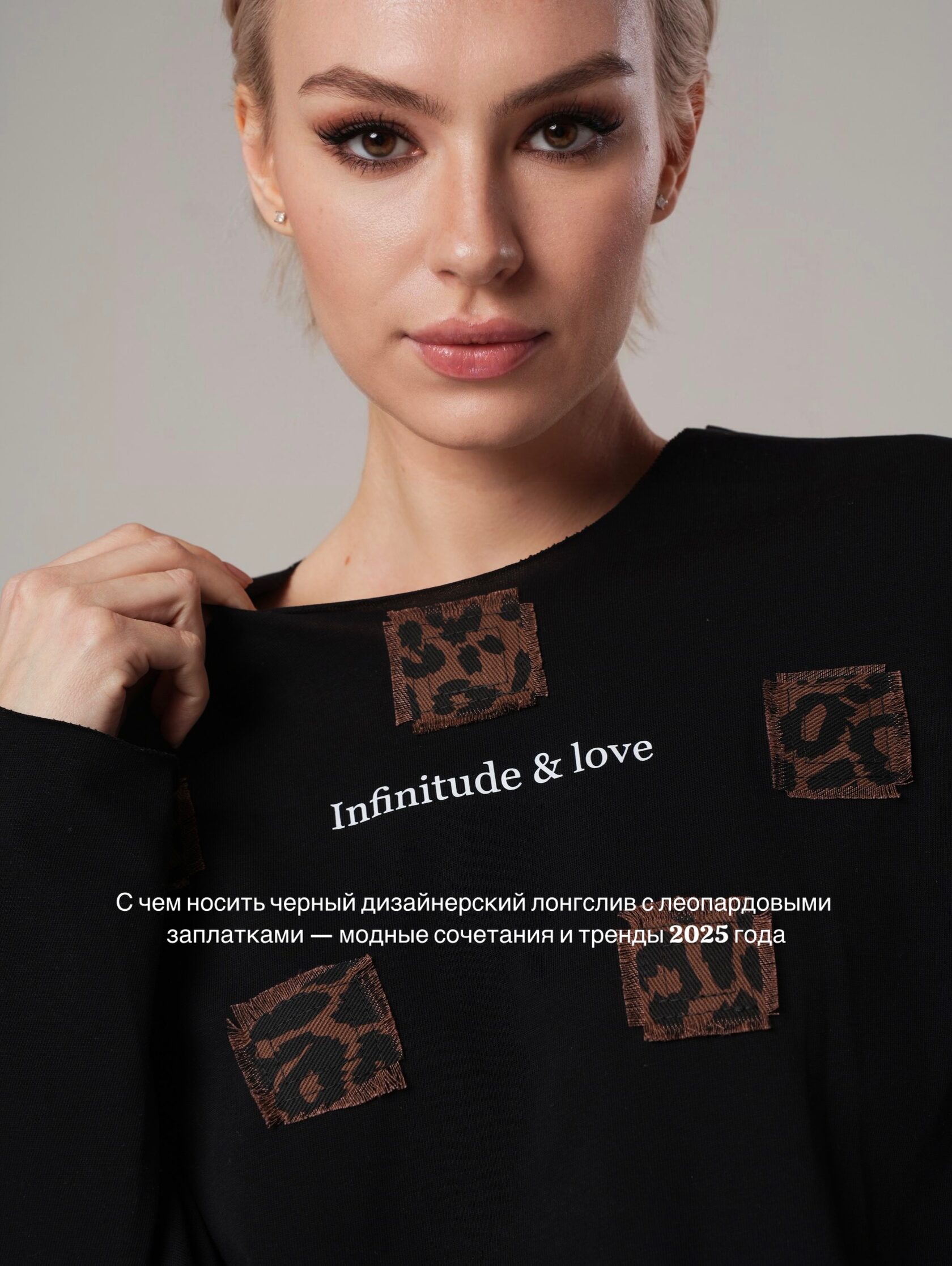 Стильный черный дизайнерский лонгслив с леопардовыми заплатками — это новый язык самовыражения в моде 2025/2026 года.