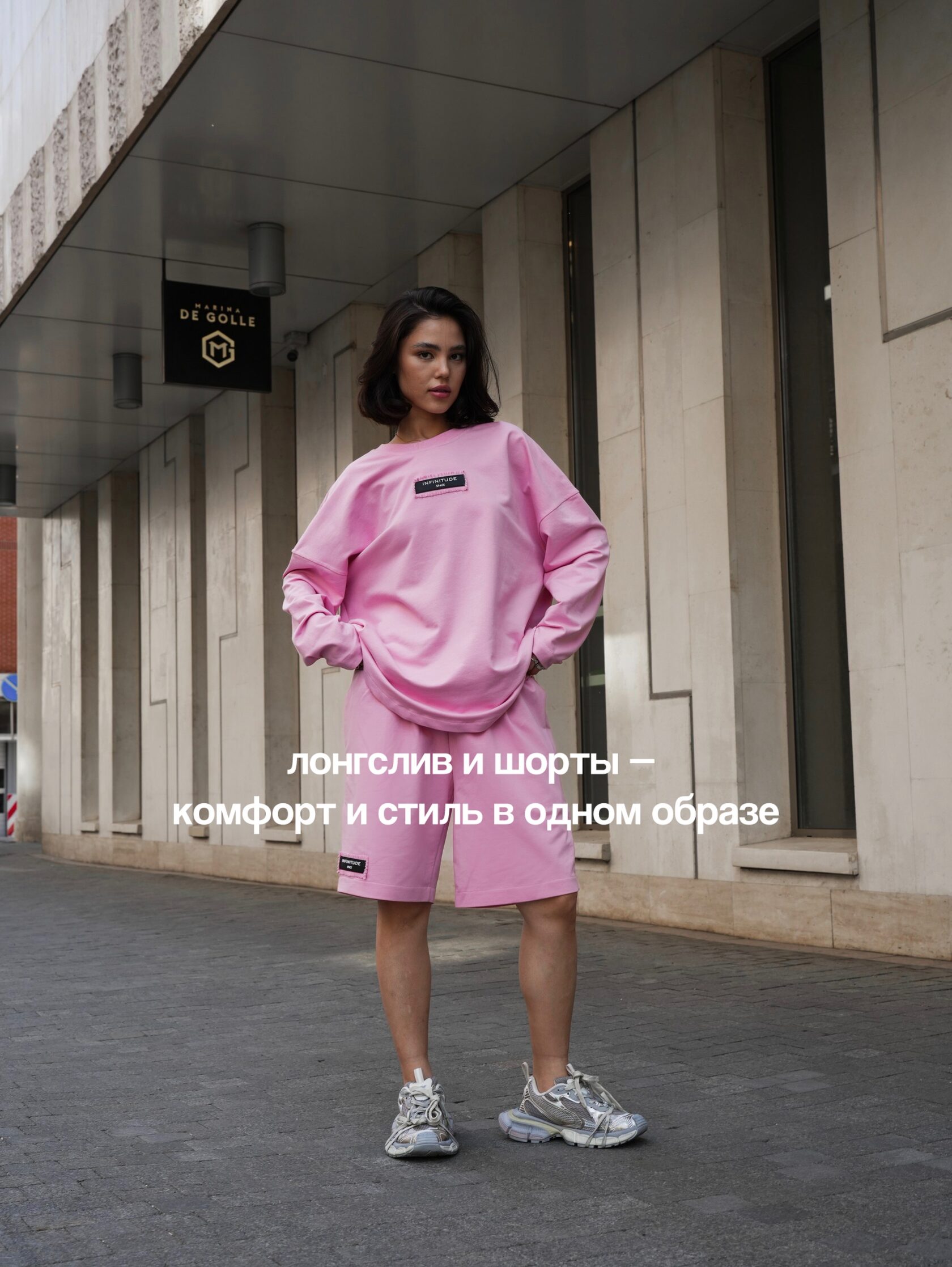 Розовый цвет уже давно вышел за рамки «инфантильного» и стал символом уверенности, свежести и актуальности. Он прекрасно смотрится на любом оттенке кожи, делает образ визуально ярче и при этом остаётся нежным. В сочетании с удобным фасоном — лонгсливом и шортами — он превращается в универсальный сет, который можно адаптировать под любой стиль: кэжуал, спорт-шик, стритстайл.