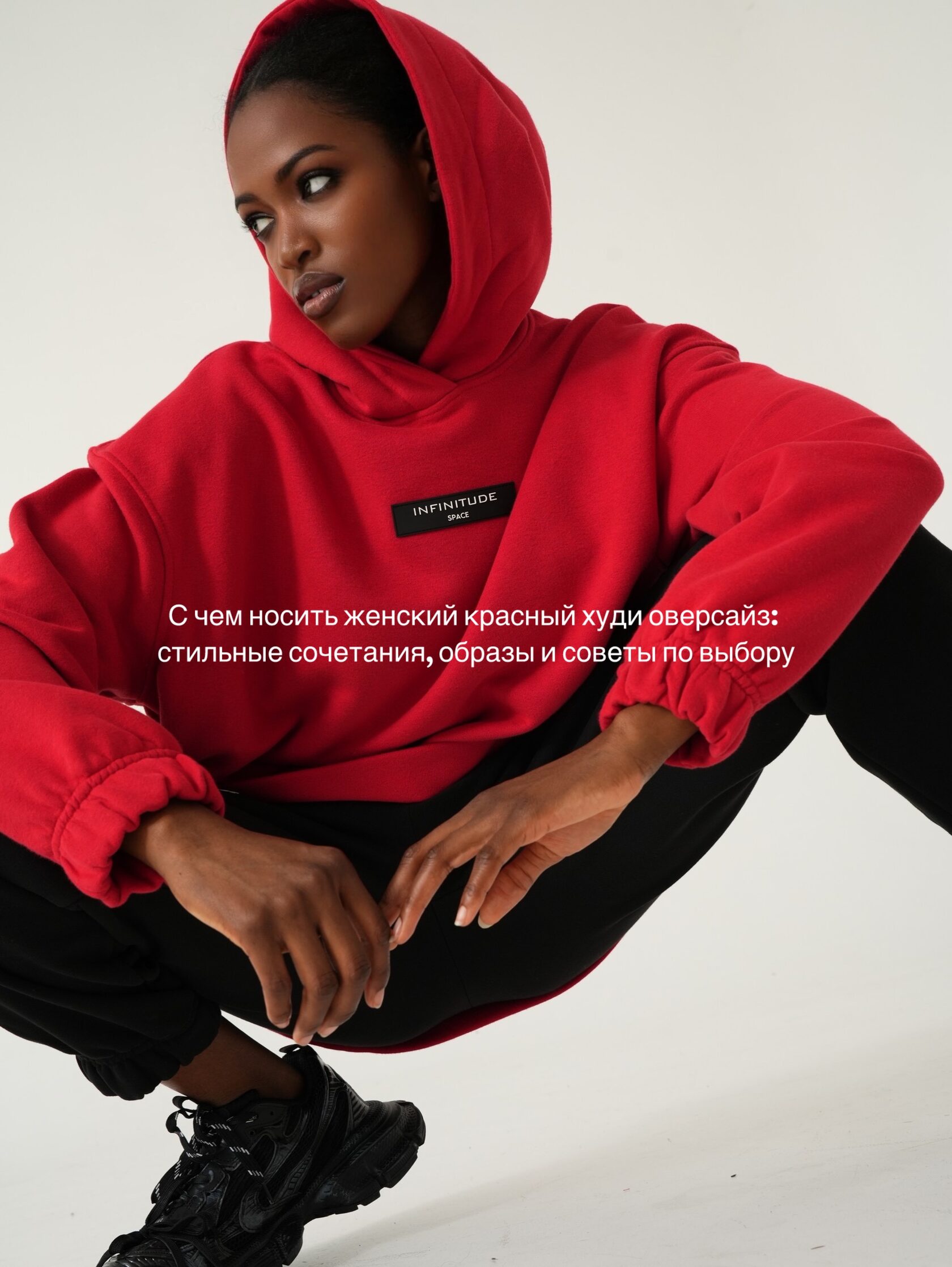 А если добавить пару модных аксессуаров и обувь на контрасте, получится стильный женский красный худи оверсайз-лук, который привлечёт внимание и станет вашим личным fashion-акцентом.